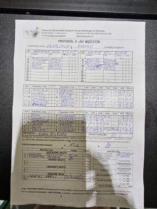 | Zawodnik | stół 1 - wygrana | stół 1 - przegrana | stół 2 - wygrana | stół 2 - przegrana | stół 1 - debel | stół 2 - debel |